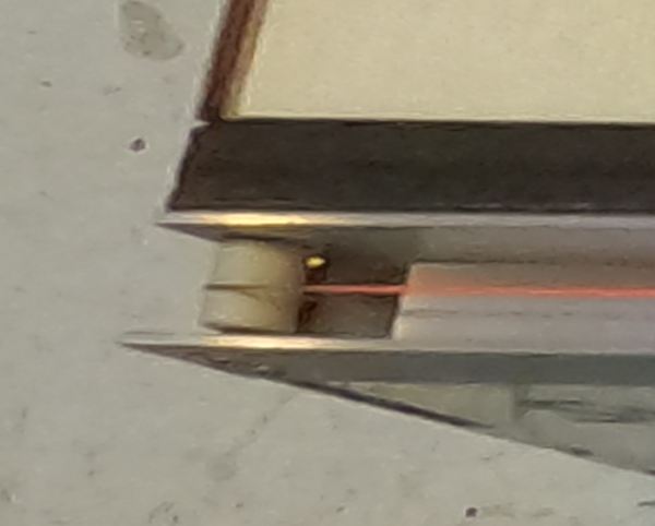 Pour cela : Percez un trou traversant entre les deux montants du tube en U et fraisez un côté pour que la vis à bois de fixation ne dépasse pas sur l’avant du banc. Il faut ensuite couper le fond du U sur une extrémité du tube (ça permettra au fils de redescendre vers l’intérieur du banc. Plus cette fente est petite plus vous pouvez positionner votre rondelle en céramique proche du bord et donc moins de zone sans chauffe vous aurez en cas de modularité avec une autre plieuse symétrique). Voici un exemple de cette partie de la plieuse en utilisation :