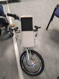 Le trotti V5 est un dispositif de motorisation de fauteuil qui s'attache à l'avant et le tracte , composé d'un moteur, d'une batterie, d'un guidon de vélo, d'un frein et d'une poignée d’accélération.